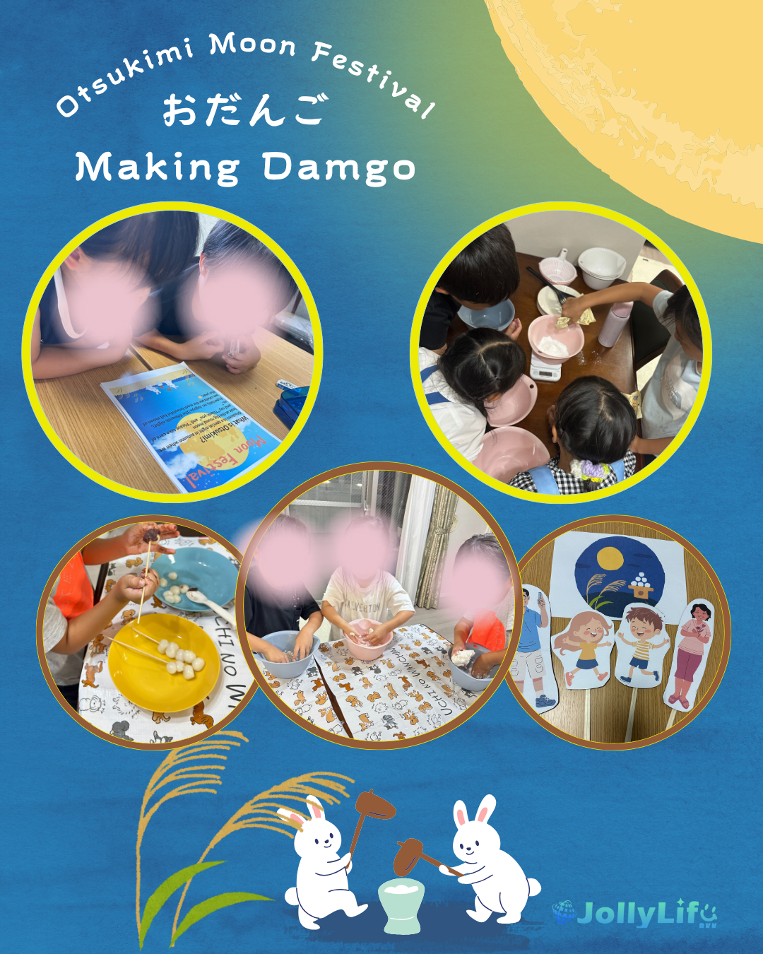 授業では、日本語と英語でお月見について説明をしたり、ペープサートを使った寸劇をして遊びました。そして「お団子作り」に挑戦!